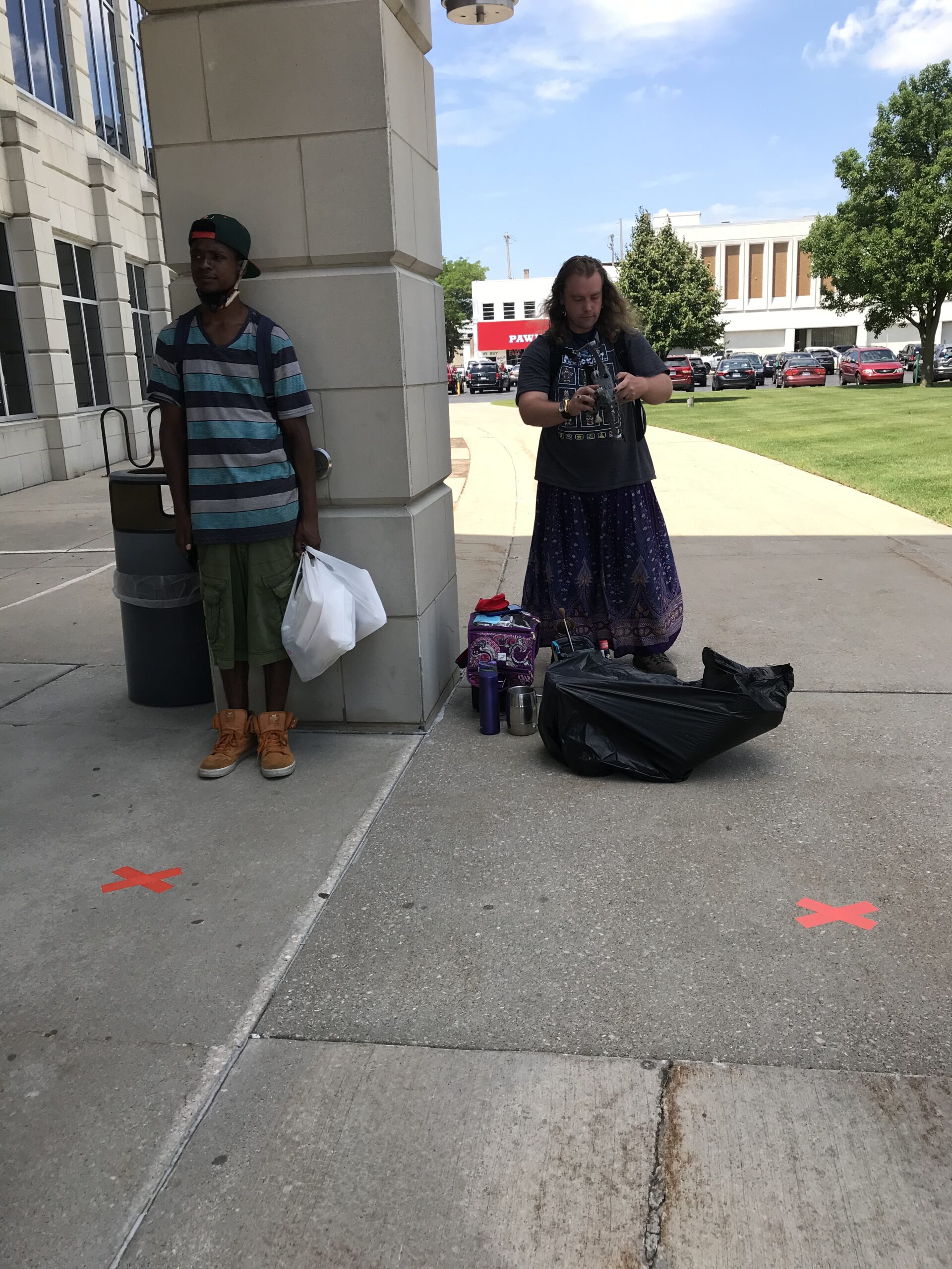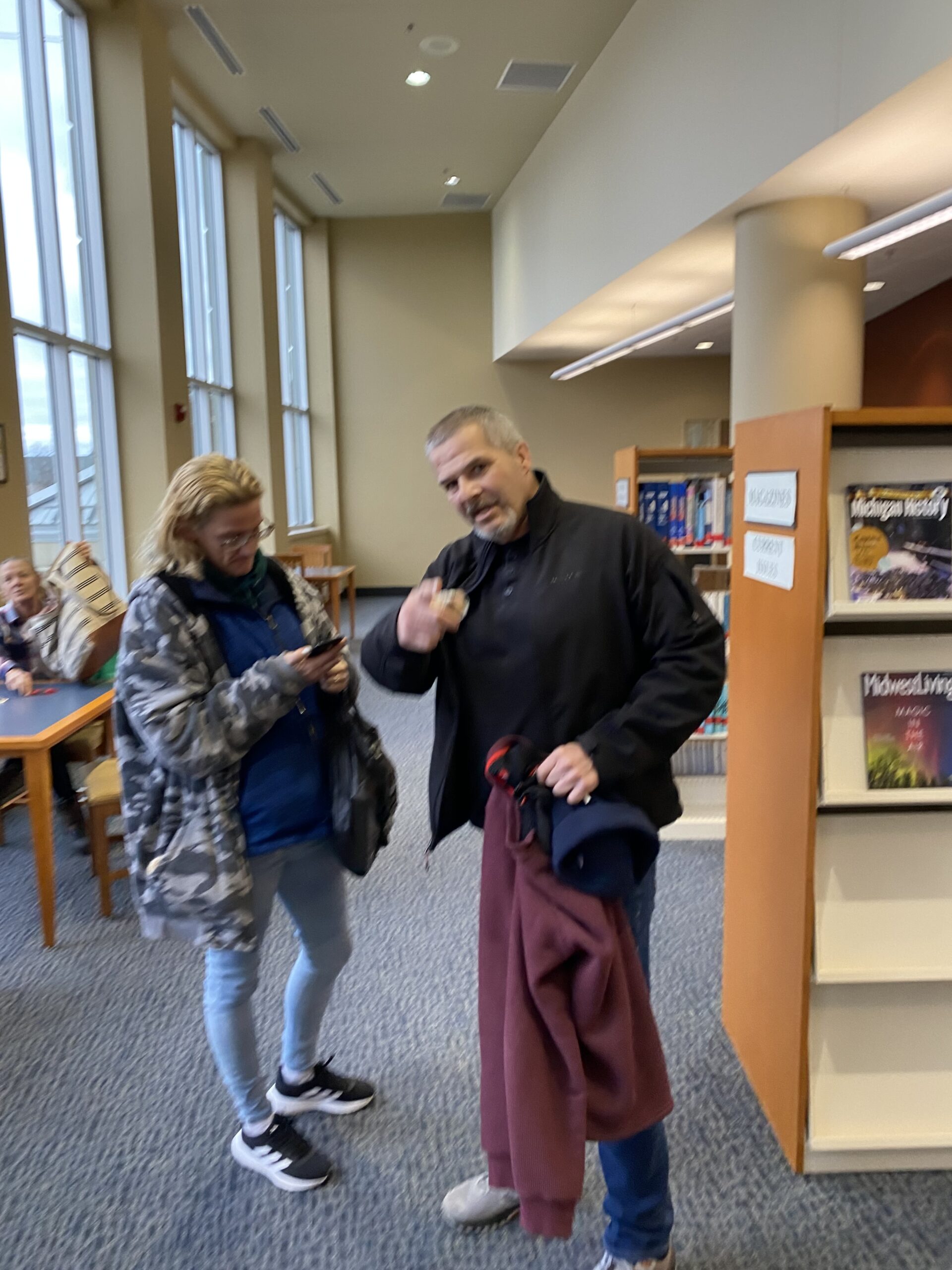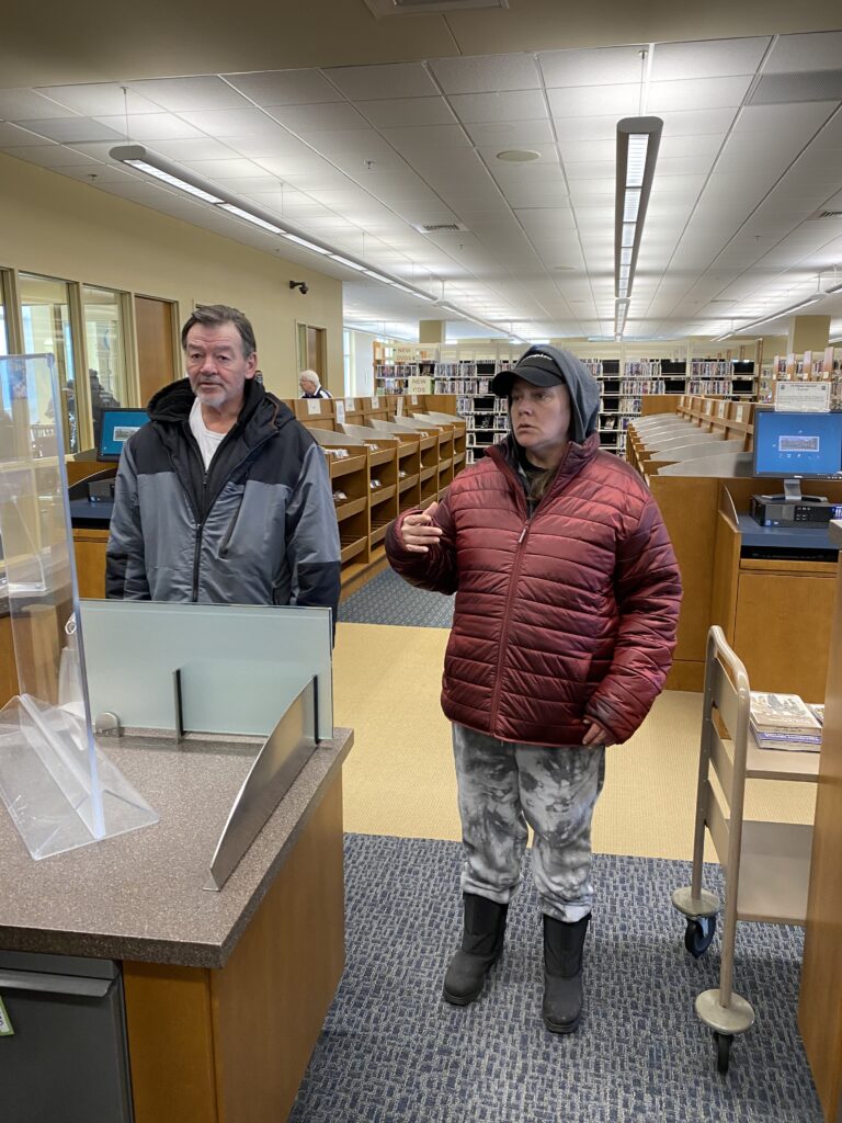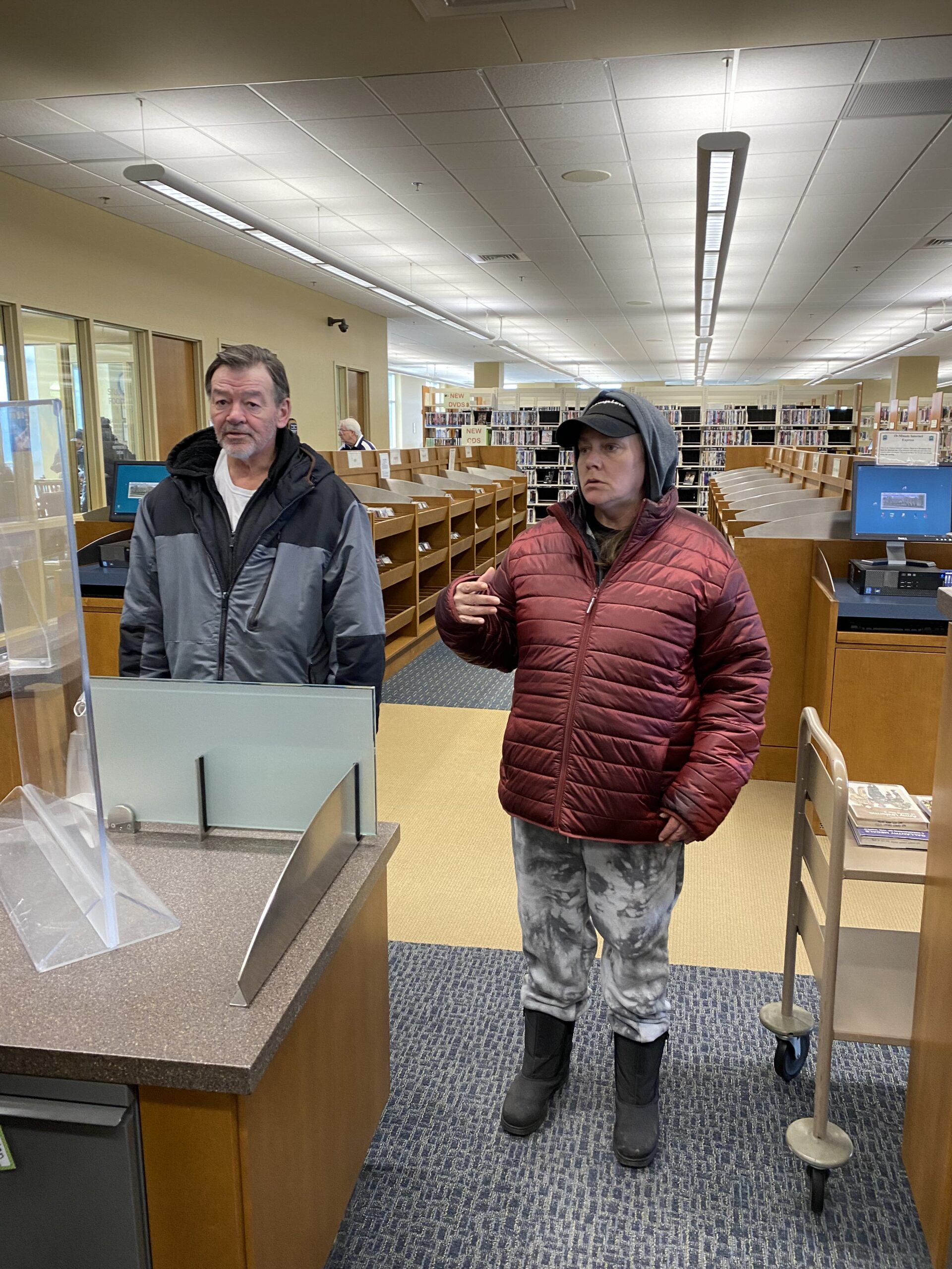 Incident Description The couple in the attached photo left their bags unattended. When staff discovered them and looked inside tobacco and open alcohol bottles were discovered inside. The couple asked about their items when they returned inside the library. They were told the library has a strict no alcohol and tobacco policy and they would not be allowed back in the library for 30 days. They denied they drink alcohol and were not happy about leaving due to their language. If you see them back before April 28 please remind them they are not allowed on BCLS property. Unfortunately we do not know their names, but most staff is familiar with them as they tend to be here every day/all day.Thank you - Kirsten Wellnitz Managing Librarian